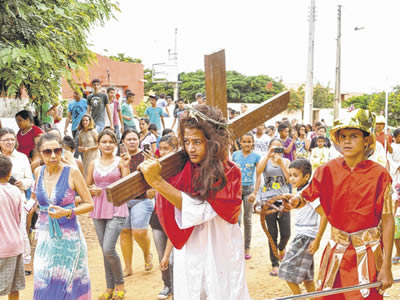 Neste ano, três cidades da região Centro-Sul e do Cariri promovem espetáculos da Paixão, Morte e Ressurreição de Cristo: Cariús, Cedro e Santana do Cariri. Neste município, o espetáculo acontece nas ruas da Agrovila, sede do Distrito Vale São Miguel. Em Cariús, será no sítio Canabrava, e em Santana do Cariri, na Praça da Matriz. Nesta cidade, a peça teatral foi protagonizada por alunos da Escola Leandro Alves Correia e a apresentação foi antecipada para ontem, pela manhã. O encerramento, com a ressurreição de Cristo, ocorreu na vila Mãe Rainha. Os estudantes representaram os passos, o sofrimento, morte e ressurreição de Jesus Cristo. O projeto foi idealizado e coordenado pelo professor Vicente Ferrer Matias de Souza e por Anderson Lima, com orientação da diretora Socorro Saraiva Moura. Em Cedro, a peça é encenada desde o ano passado, como projeto pedagógico. O espetáculo atraiu centenas de moradores e mais uma vez o tema da Campanha da Fraternidade, que neste ano, trata do serviço ao próximo, foi usado como música de fundo. "Em 2015, o objetivo geral do evento é relembrar a natureza da vitória gloriosa de Jesus Cristo e provocar reflexões sobre a páscoa para os alunos e comunidade escolar através dos pais e funcionários", disse a diretora, Socorro Saraiva. Os moradores da zona rural de Cariús estão mobilizados, desde a semana passada, em torno dos preparativos da encenação da Paixão de Cristo. O elenco do Grupo de Teatro "Os Matutos", criado há 18 anos, é composto por estudantes, agricultores e donas de casa, que se transformam em atores e figurantes para apresentar a Via Sacra, nesta sexta-feira, a partir das 17 horas, no Sítio Cana Brava. A encenação é um ato de fé e de emoção no sertão para rememorar a paixão e morte de Jesus Cristo. O espetáculo ao ar livre deve atrair cerca de duas centenas de moradores. As famílias e atores esperam que o tempo seja favorável. A Via Sacra foi apresentada pela primeira vez no Sítio Cana Brava em 2011.