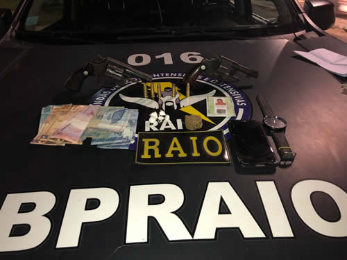 Em meio à diligência, por volta de 16 horas, uma equipe do BP Raio se deparou com os infratores na Rua dos Inocentes, no bairro Prado. Os suspeitos foram abordados e os policiais conseguiram recuperar R$ 227, apreenderam dois revólveres, sendo um calibre 38 e outro calibre 32, municiados, 13 gramas de maconha, quase 4 gramas de cocaína, 3 celulares e a moto utilizada no assalto, uma Bros azul de placa POB 4790.