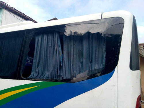 O para-brisas traseiro do micro-ônibus ficou destruído. Conforme a PM, nenhum agente que estava a bordo ficou ferido.
