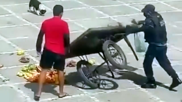 Também é possível ouvir o vendedor ambulante pedindo que o policial não derrube as mercadorias. “O senhor não pode fazer isso comigo não. O senhor está me prejudicando”, grita o ambulante enquanto o policial joga as frutas no chão.